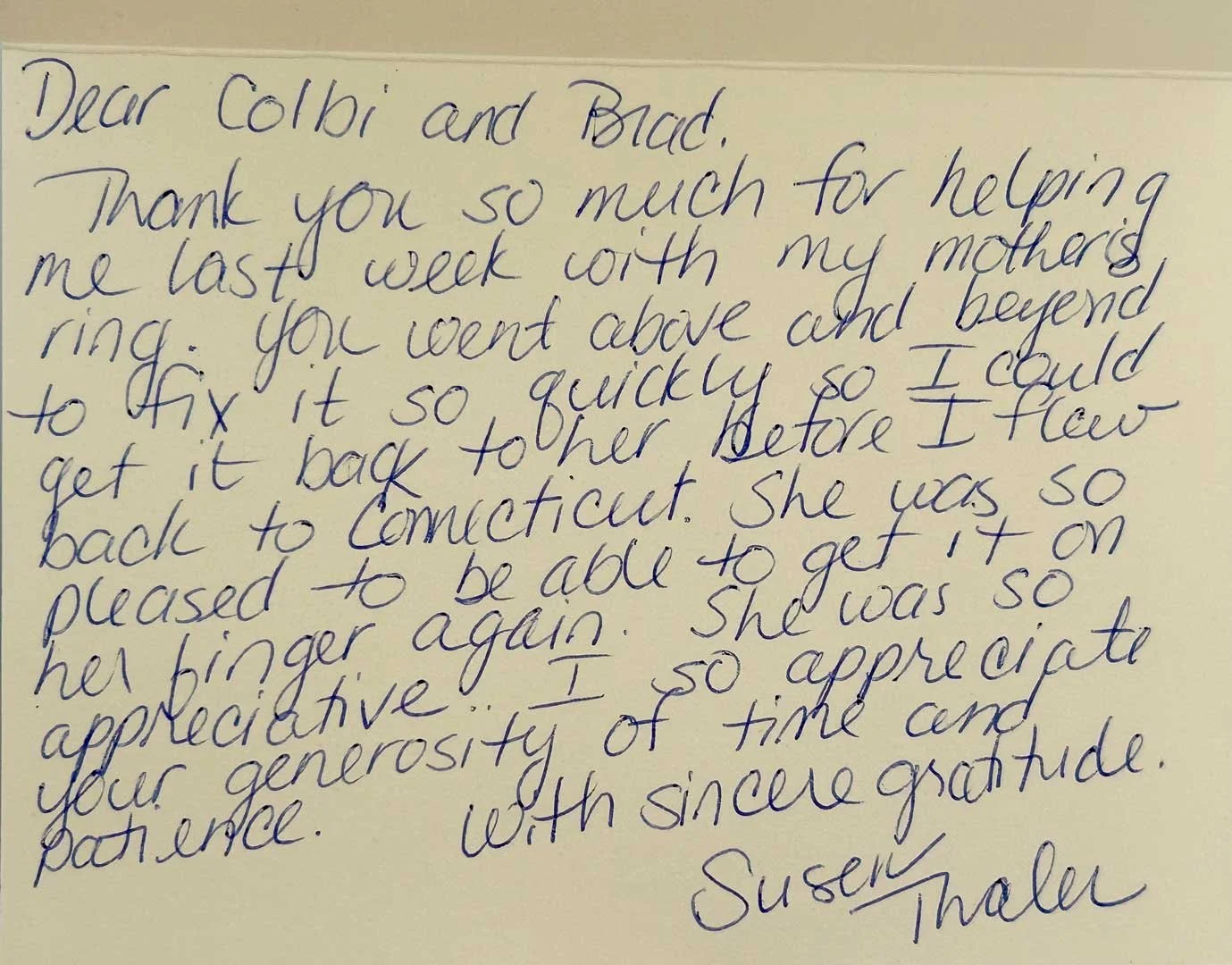 “Thank you so much for helping me last week with my mother’s ring. You went above and beyond to fix it so quickly so I could get it back to her before I flew back to Connecticut. She was so pleased to be able to get it on her finger again. She was so appreciative. I so appreciate your generosity of time and patience.”