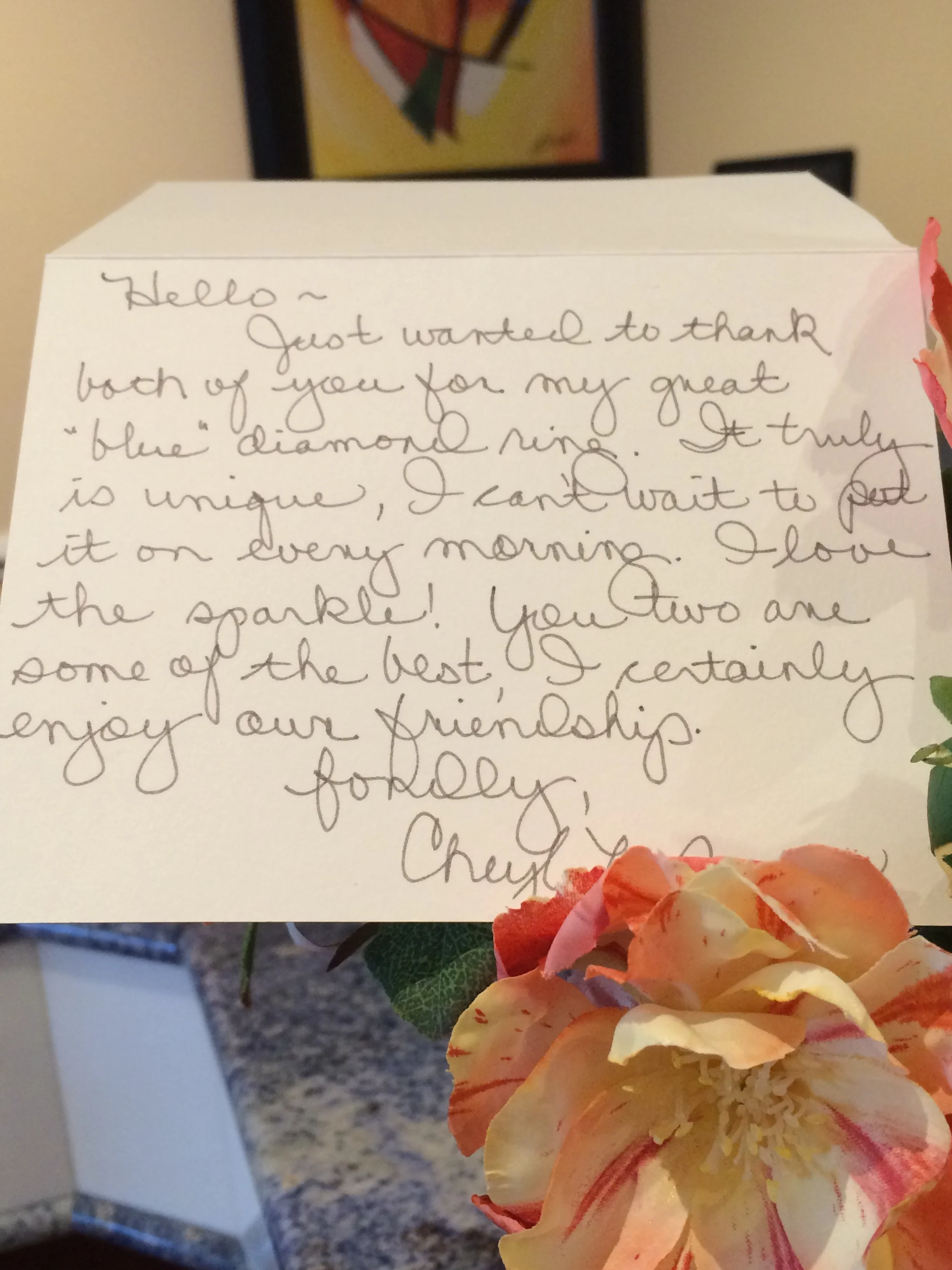 “I just wanted to thank both of you for my great ‘blue’ diamond ring. It truly is unique, I can’t wait to put it on every morning. I love the sparkle! You two are some of the best, I certainly enjoy our friendship.”