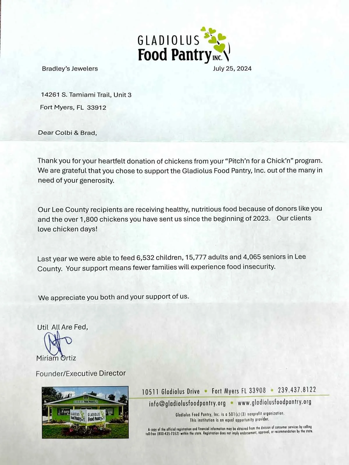“Thank you for your heartfelt donation of chickens from your “Pitch’n for a Chick’n” program. We are grateful that you chose to support the Gladiolus Food Pantry, Inc. out of the many in need of your generosity.